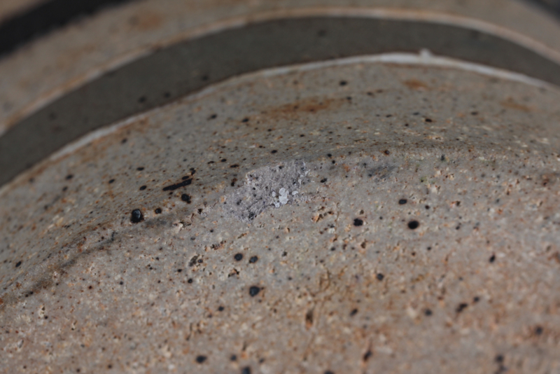 The unglazed vase has a matte black/grey decoration of horizontal stripes.